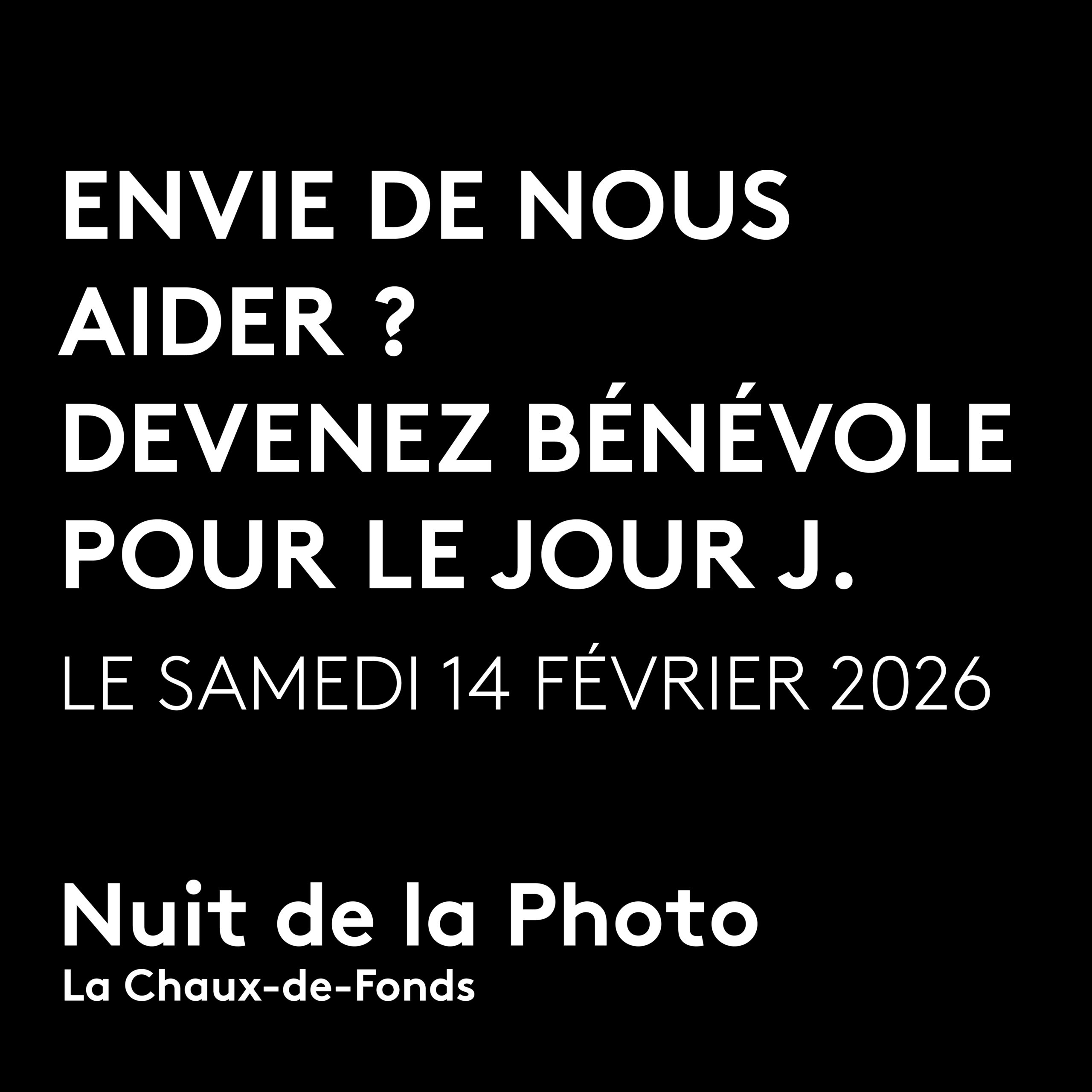 La Nuit de la Photo approche à grands pas, et nous avons besoin de vous pour faire de cette 13ᵉ édition un succès ! Nous recherchons des bénévoles motivés pour nous prêter main-forte le samedi 14 février 2026 et le dimanche 15 février 2026. C’est l’occasion de vivre cet événement unique de l’intérieur, d’être au cœur de l’action, et de contribuer à une soirée mémorable dédiée à l’art photographique.